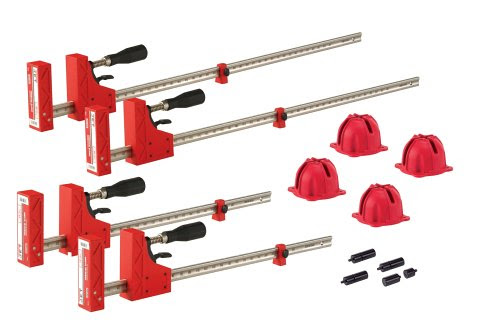 Upgrade your workbench clamps and get the largest clamping surface in the industry! Jaw depth is 4-1/8". Features non-marring composite resin jaw faces that provide even clamping pressure. Jaws also reverse as a spreader.Ergonomic handle has soft grip for added comfort and increased torque. With Slide-Glide trigger for fast, easy adjustments and rule measurement system for a consistent setup. Moveable end stop helps preset clamping capacity. The parallel clamp kit offered here includes two 24" parallel clamps, two 40" parallel clamps and one 4-pack of framing blocks, which are used to arrange 4 clamps in rectangular configuration.